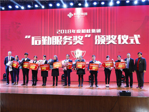 (源生堂工程部季明明(左三)教育部李春燕(左四)榮獲集團“后勤服務(wù)獎”)